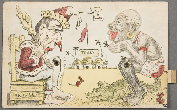 A FRENCH POLITICAL SATIRE MECHANICAL POSTCARD early 20th century. Depicting a Royal Court jester kicking an African. Postally unused. Very good to excellent working condition.