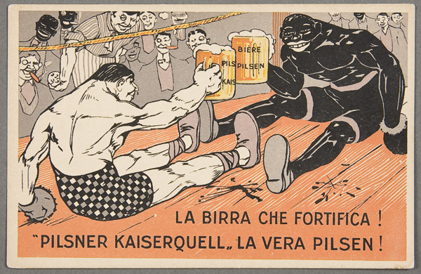 AN ITALIAN BEER ADVERTISING POSTCARD early 20th century. Depicting black and white boxers drinking Pilsner beer. Postally unused. Very good to excellent condition.