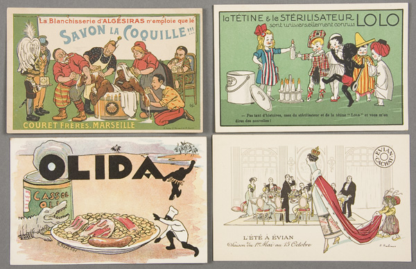 FOUR FRENCH ADVERTISING POSTCARDS early 20th century. All black related including Olida, Evian, Lolo and Savon la Coquille. All postally unused. Excellent to near mint condition.