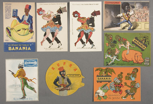 EIGHT FOREIGN ADVERTISING TRADE CARDS early 20th century. Including two hold-to-light cake walk dancers, three for Banania including a cut-out, a Capadura and a Mayo's Tobacco. Very good to excellent condition.