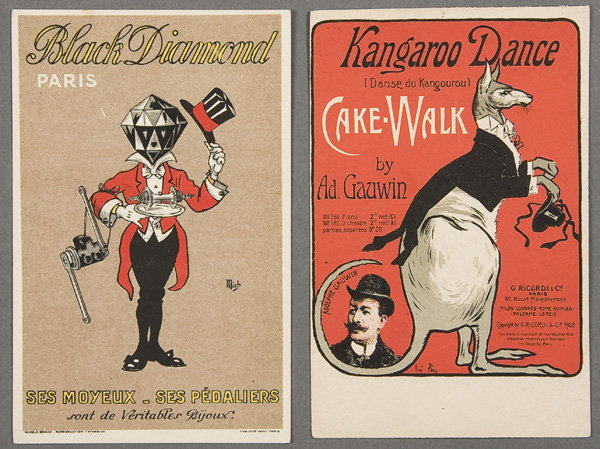 TWO ART DECO ADVERTISING POSTCARDS early 20th century. For French Black Diamond bicycle parts and a Kangaroo Dance cake walk by Gauwin. Both postally unused. Excellent condition.