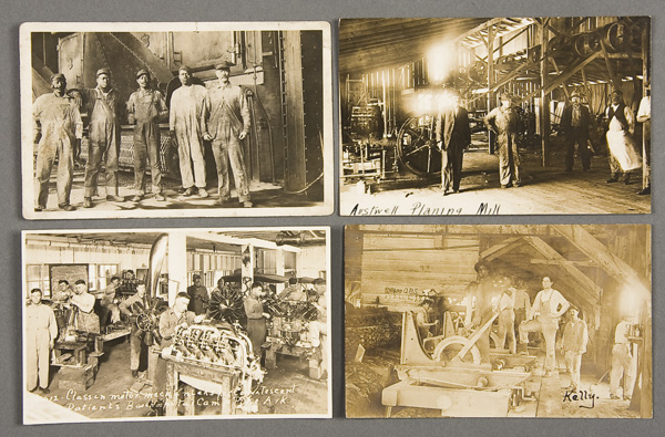 FOUR OCCUPATIONAL REAL PHOTO POSTCARDS early 20th century. Three factory interiors and a motor mechanics classroom in Camp Pike, Arkansas. Three postally unused. Good to excellent condition.