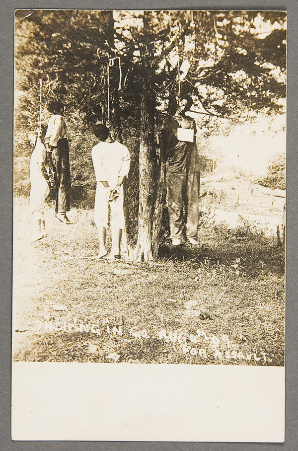 A BLACK LYNCHING REAL PHOTO POSTCARD dated 1911. The scene depicts four hanging black corpses with inscription Lynching in Ga. August 4 '09 for assault. Postmarked Blowing Rock, NC 1911. Very good condition.