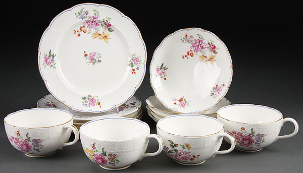 AN ENGLISH PORCELAIN PARTIAL DINNERWARE GROUP, LATE 18TH/EARLY 19TH CENTURY. Probably by New Hall, comprising five 8 inch plates and four coffee cups and saucers, each with floral transfer decoration and embossed basket weave pattern. Hand-painted pattern #N.5073.