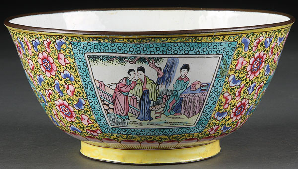 A CHINESE CANTON STYLE ENAMELED BOWL, 19TH CENTURY. With two scenic reserves on a yellow ground with all over polychrome florals raised on a circular foot, the interior with chrysanthemum center and floral sprays on white enameled ground. Seal mark on base. Diameter 7.5 inches (19 cm).
