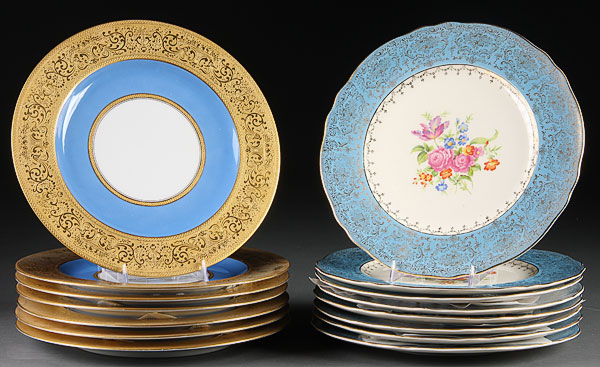 A BLACK KNIGHT AND STEUBENVILLE PORCELAIN DINNER PLATE GROUP, MID-20TH CENTURY. Comprising seven “Black Knight” plates with etched and gilt rims and eight “Steubenville” floral decorated plates. Diameter 11 inches.