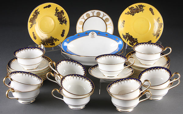 A ROYAL DOULTON AND WEDGWOOD PORCELAIN DINNERWARE GROUP, comprising 13 Wedgwood cup and saucers with blue and gilt decoration together with two Royal Doulton Claridges Hotel nappies and two Masons saucers.