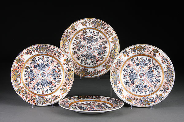 A SET OF FOUR WEDGWOOD NINGPO DINNERWARE PLATES, EARLY 19TH CENTURY. Blue and red transfer with gilt decoration. Diameter 10.5 inches.