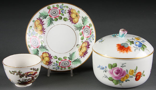 A THREE-PIECE 18TH/19TH CENTURY PORCELAIN GROUP, comprising a Nymphenburg hand-painted cup with bird on branch, a Meissen lidded box and Coalport saucer. Diameter 5.75 inches (14.5 cm).