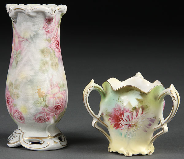 A ROYAL BAYREUTH ROSE TAPESTRY HAT PIN HOLDER, CIRCA 1900, and an R.S. Prussian three handled toothpick. Height 4.5 inches (11.5 cm).