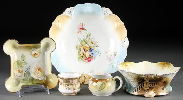 A FIVE-PIECE R.S. GERMANY & PRUSSIA PORCELAIN GROUPING, circa 1900. Comprising an unmarked berry bowl, R.S. Prussia “swans” fernery (crowsfoot), R.S. Germany relish, Tillowitz creamer and an unmarked demitasse cup. The largest 10.5 inches diameter.