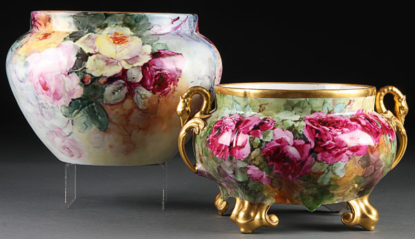 TWO ARTIST-DECORATED PORCELAIN JARDINIÈRES, EARLY 20TH CENTURY. Comprising a swan handled and scrolled footed planter.