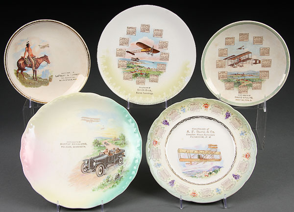 A FIVE-PIECE EARLY AVIATION THEME PORCELAIN GROUP, EARLY 20TH CENTURY. Comprising three 1912 calendar plates and two Merchant advertising plates. All with early airplane decoration. Diameter 7.125 inches to 9.125 inches.