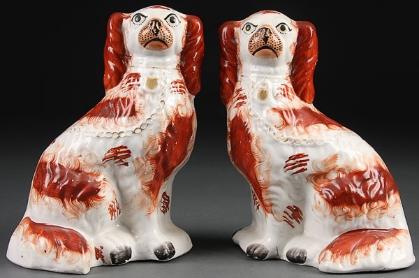 A PAIR OF 19TH CENTURY STAFFORDSHIRE HOUNDS, with painted features and decoration. Height 9.5 inches.