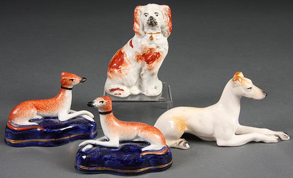 A GROUP OF THREE 19TH CENTURY STAFFORDSHIRE HOUNDS, with painted decoration. Together with an art deco Japanese figural dog. The largest 5.5 inches.