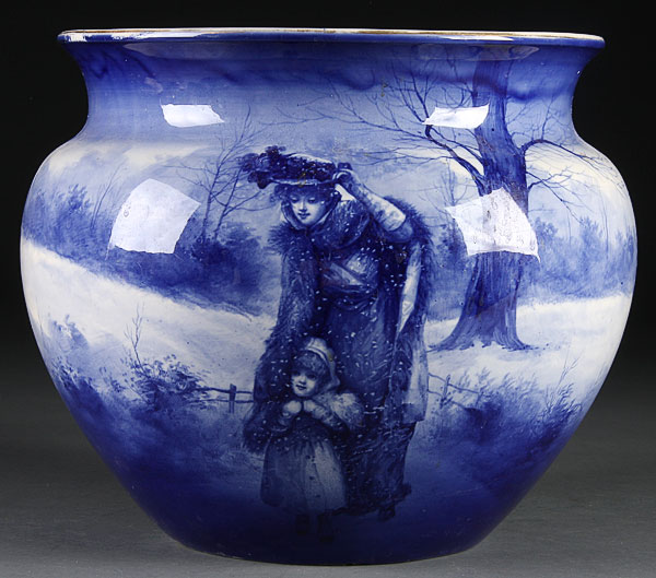 A ROYAL DOULTON BLUE CHILDREN SERIES JARDINIÈRE, CIRCA 1900. “Mother Sheltering Child.” Glaze chips on base. Diameter 13.5 inches.