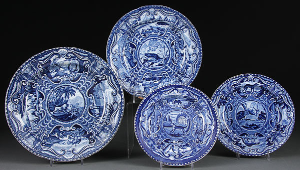 A GROUP OF FOUR EARLY 19TH CENTURY STAFFORDSHIRE "QUADRUPEDS" PATTERN PLATES, by Hall. Consisting of an 8.5 inch otter, 10 inch lion, 7.5 inch gazelle and 7 inch dog.