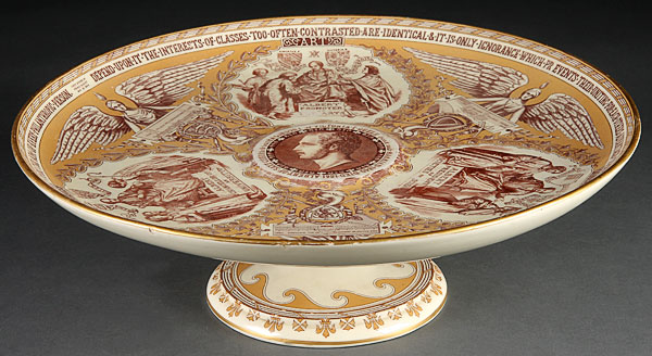 AN ENGLISH STAFFORDSHIRE FOOTED PRINCE ALBERT COMMEMORATIVE TAZZA, 1863 ART UNION OF LONDON. With scenic reserves depicting the arts. Diameter 16.5 inches.