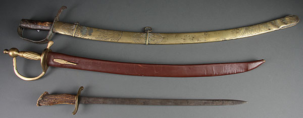 GROUP OF THREE EDGED WEAPONS, 19TH AND 20TH CENTURY. Comprising a 19th century calvary saber in relic condition with replaced grip, basket and guard contained in an engraved brass scabbard, a German hunting cutlass with stag handle (scabbard absent) and a reproduction cutlass and leather scabbard. Length 24 – 37 inches.