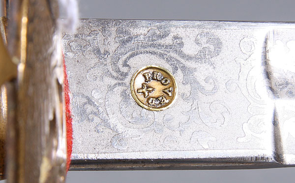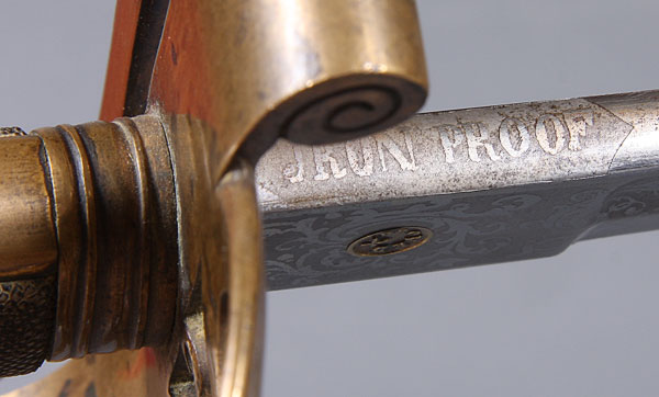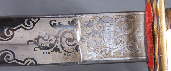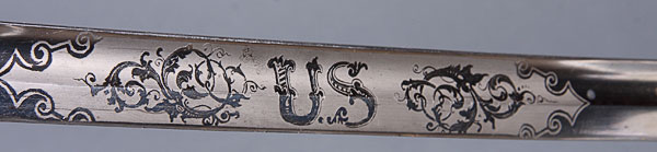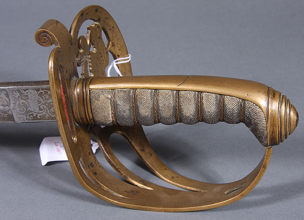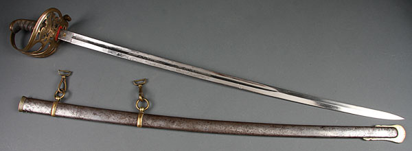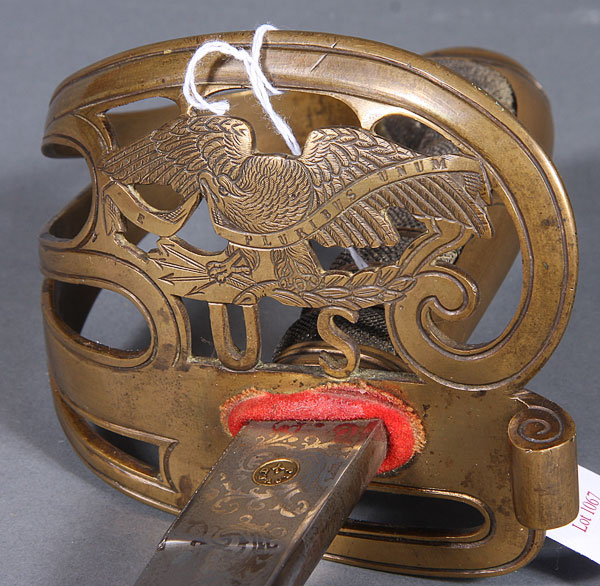 CIVIL WAR SWORD - A MODEL 1850 NON-REGULATION FOOT OFFICERS SWORD. 32.5" single edged bright blade with false edge and 3/4 length fuller, with etched scrollwork, shield breasted eagle, U.S. and other patriotic motifs, right ricasso with inset brass medallion with Proved, left marked Horsler Solingen, and marked on top edge Iron Proof; single piece brass quillon/guard/knuckle bow with scrolled quillon, open guard with spread winged shield breasted eagle clutching arrows and olive branch with ribbon banner above with E. Pluribus Unum and U.S. below, and reeded bow with slot for sword knot, cast brass stepped oval pommel with full backstrap with central drop, reeded ray skin grip. Steel scabbard with flaring stepped brass throat top and double brass suspension rings with clip hangers, and brass drag; total length 39”.