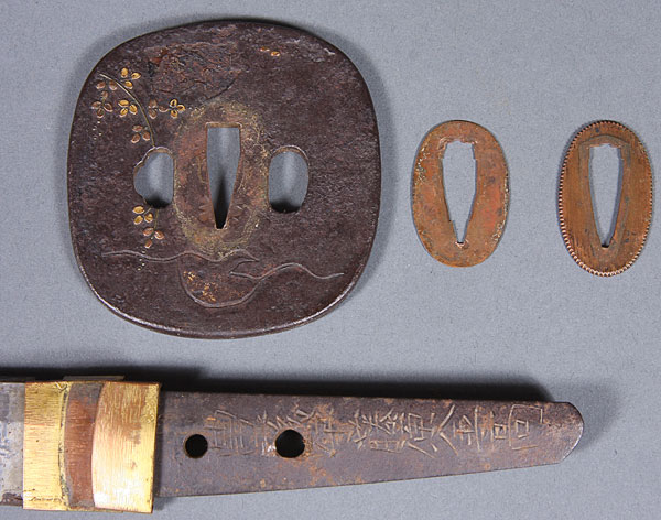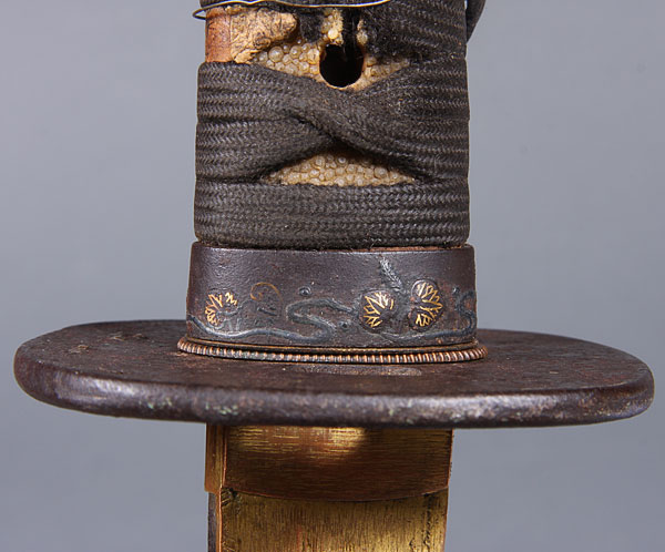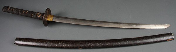 A JAPANESE SHORT SWORD – WAKIZASHI, 19TH CENTURY. Length (nagasa) 21.6 inches (55cm). Overall length including tang 26.8 inches (60.2cm). Signed tang, iron tsuba inlaid with mixed metal, wrapped handle and black lacquer scabbard.