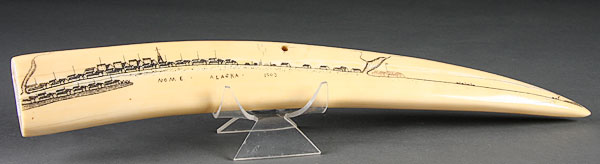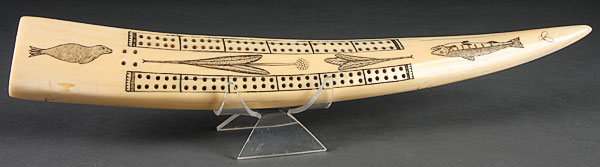 A VERY FINE NOME, ALASKA CARVED WALRUS TUSK CRIBBAGE BOARD, EARLY 20TH CENTURY. The obverse with incised game board and drilled peg holes decorated with a walrus, salmon and various plants; the reverse with conforming skyline cityscape inscribed "Nome, Alaska 1903." Length 16.5 inches.