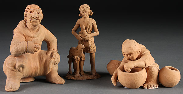 THREE TERRACOTTA FIGURAL GROUPS, 20th CENTURY. Comprising a shepherd boy with lamb and goose (repaired), a seated man and a Native American potter. Height 3.5 inches to 6 inches.