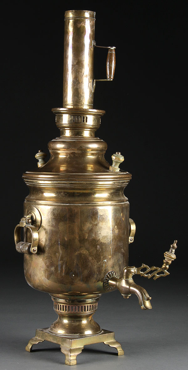 A RUSSIAN SAMOVAR, 19TH CENTURY. Cylindrical brass form resting on four raised feet with swivel side handles and large chimney. Height 27.25 inches.