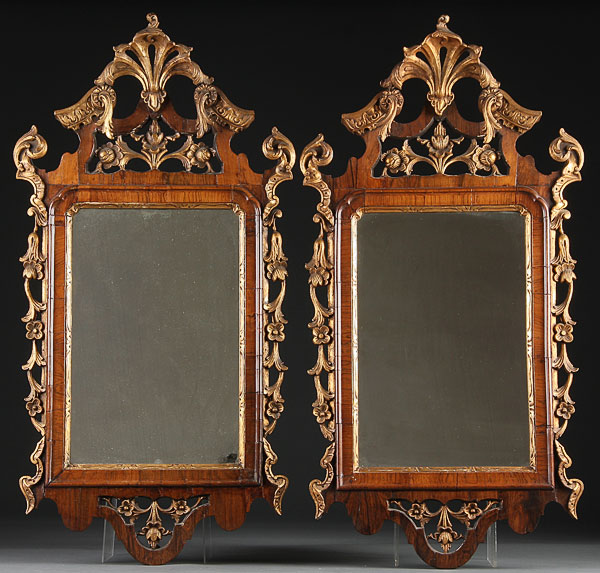 A PAIR OF CHIPPENDALE STYLE CARVED MAHOGANY AND GILT WOOD WALL MIRRORS, EARLY 20TH CENTURY. With scroll cut and reticulated decoration. Height 35 inches, width 18 inches.