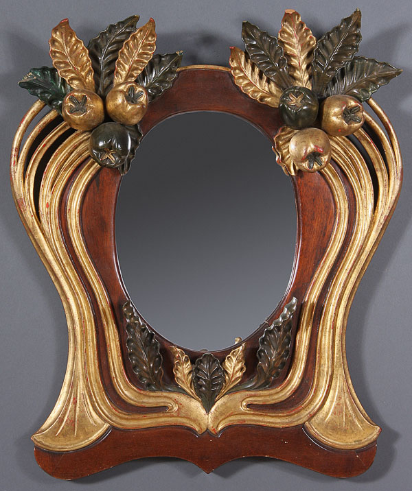 A CONTEMPORARY CARVED AND POLYCHROME GILT WOOD WALL MIRROR, with extended fruit and foliate decoration. Height 28.75 inches.