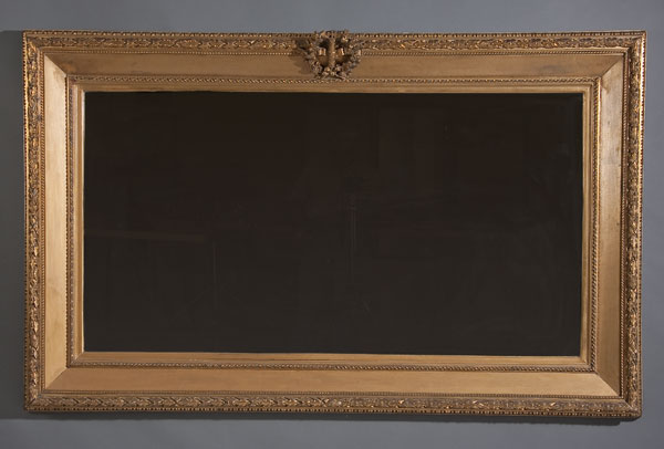 A LARGE GILT WOOD AND MOLDED GESSO MANTLE MIRROR, 19TH CENTURY. With foliate wreath crest. 45 inches x 72 inches.