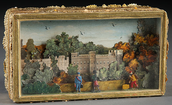 A HAND-PAINTED AND CUT PAPER MINIATURE DIORAMIC SCENE/ TRINKET BOX, CIRCA 1940. By Narcissa (Niblack) Thorne. Depicting an English estate in three dimensional form. Contained in a glazed shadow box lidded trinket box. Inscribed "Original design by Narcissa Thorne." Length 6.75 inches. Lot is accompanied by newspaper articles and biographical notes from the Art Institute of Chicago regarding Mrs. Thorne's creations of miniature dioramas and interior room settings.
