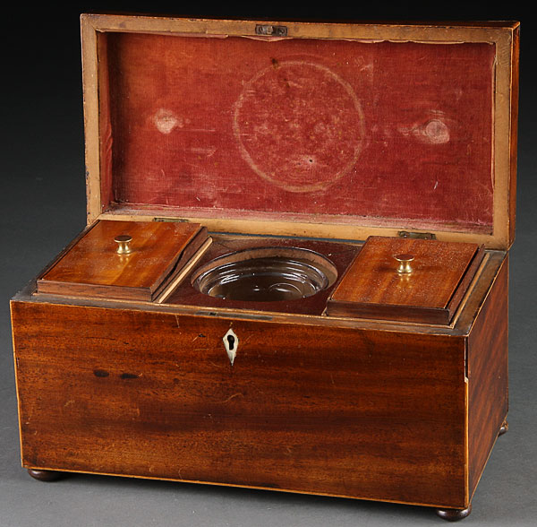 A GEORGE III MAHOGANY TEA BOX, with two-lidded, lead-lined canisters flanking a replaced press glass mixing bowl. Length 12 inches (30.5 cm).