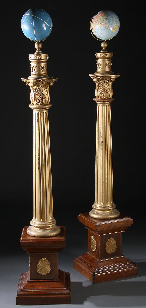 A VERY FINE PAIR OF MASONIC LODGE COLUMNS, CIRCA 1930'S. Carved and fluted gilt wood columns raised on shaped walnut plinths and surmounted by a tertiary and celestial globe. Height approximately 96 inches (244 cm).