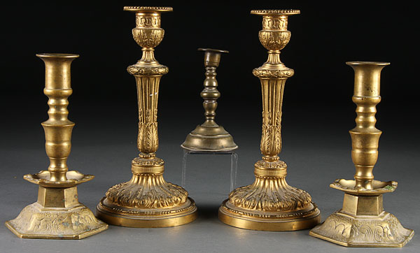 FIVE GILT BRONZE AND BRASS CANDLESTICKS, 19TH/20TH CENTURY. Comprising a pair of French empire gilt bronze candlesticks, height 11 inches. A pair of early India brass candlesticks, and a single continental brass 19th century candlestick.