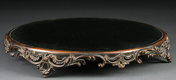 A VICTORIAN MIRRORED PLATEAU, with round beveled mirror in Rococo metal stand. Remnants of silvering. Diameter 15.25 inches.