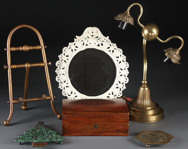 A VICTORIAN BRASS TABLE EASEL, of inverted harp form; together with an inlaid rosewood jewelry box, a brass two arm piano lamp and Victorian style cast iron mirror frame. The largest 15.5 inches.
