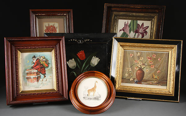 A GROUP OF SIX VICTORIAN FRAMES AND PRINTS, comprising a deep walnut frame with botanical print, a deep walnut frame with print of Santa Claus, a gilt frame with a print after G.H. Williams, an oval walnut frame with book plate engraving of a giraffe, a deep walnut frame with T. Curtis floral book plate dated 1808; together with a folding magazine wall pocket. The largest 20 inches x 16 inches.