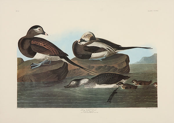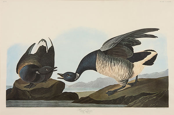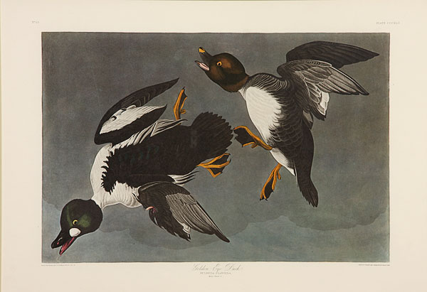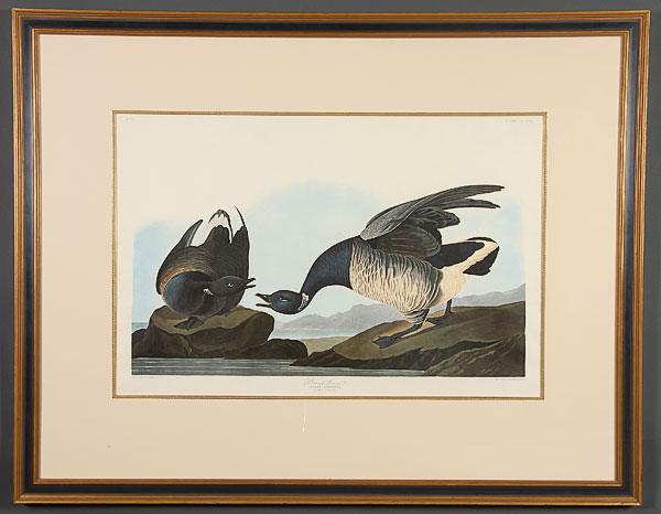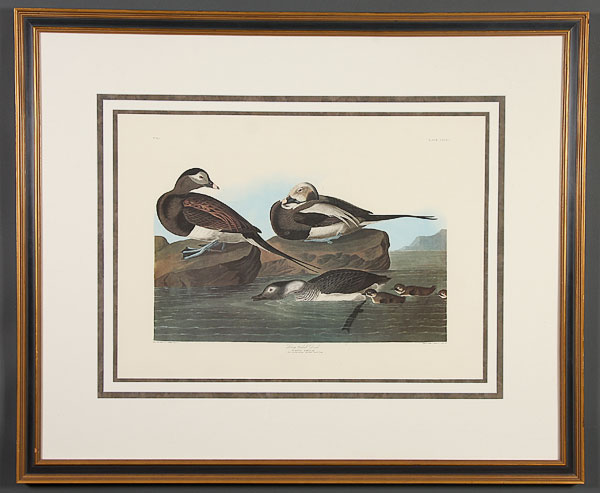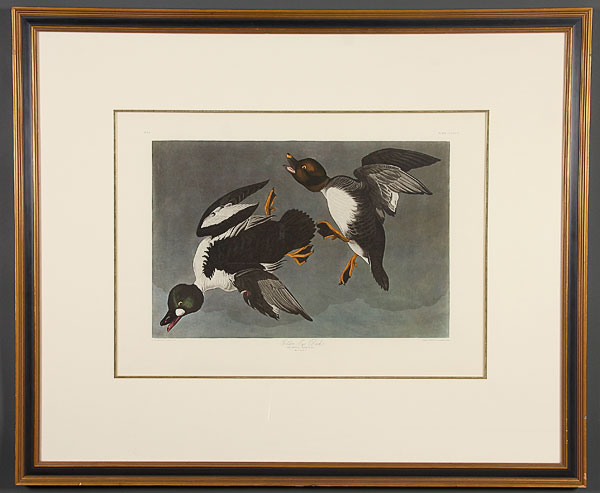 AFTER JOHN JAMES AUDUBON (AMERICAN 1785-1851), A group of three offset chromolithographs, 20th century. Including "Golden-Eye Duck", sight 24 inches x 34 inches; "Brant Goose", sight 25 inches x 38.5 inches; and "Long-Tailed Duck", sight 24.5 inches x 34.25 inches. Each presented in a molded gilt and ebonized hardwood frame, two with raised liners, the interior edge framed in gilt hardwood, and one with a linen faced mat with matching raised inner mat over a marbleized secondary mat. Overall 44 inches x 52.75- 56.25 inches