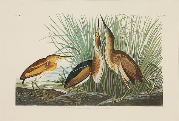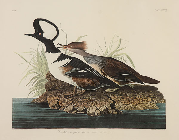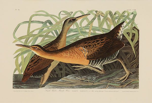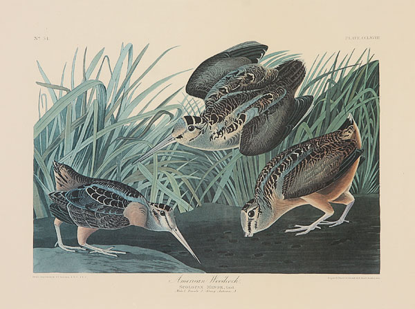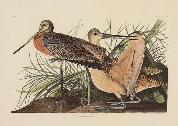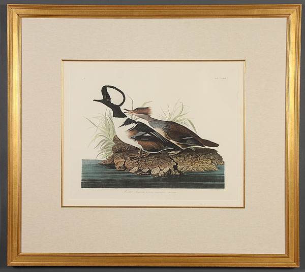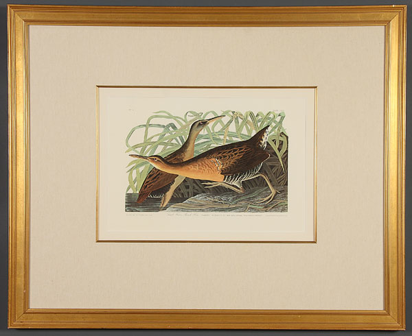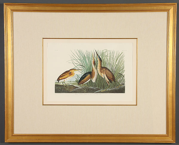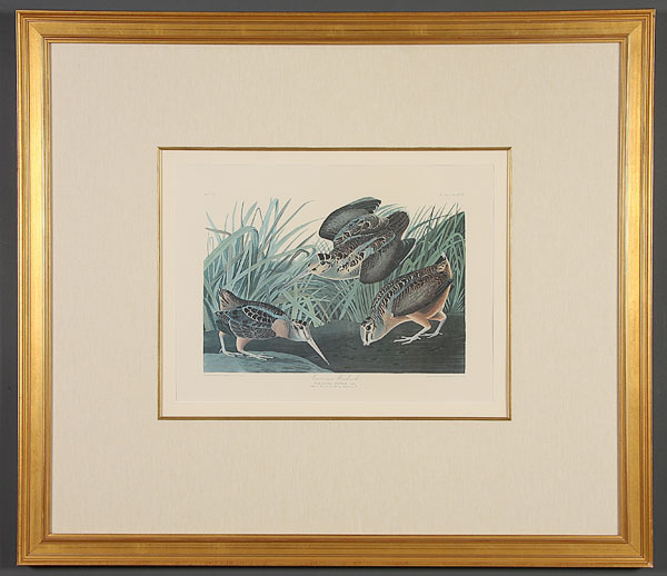 AFTER JOHN JAMES AUDUBON (AMERICAN 1785-1851), A group of five offset chromolithographs, 20th century. Including "Wooded Merganser," sight 22 inches x 28.5 inches; "Great Marbled Godwit," sight 16 inches x 22.5 inches; "Least Bittern," sight 15 inches x 22 inches; "French Water Marsh Hen," sight 15 inches x 22 inches; and "American Woodcock," sight 16.25 inches x 22.5 inches. Each presented in a gilt and molded hardwood frame with linen faced raised liners, the interior edge framed in gilt hardwood over a beveled mat board. Overall (two) 35.5 x 43.5 inches, (two) 38 inches x 43.5 inches and (one) 43.5 inches x 48.5 inches.