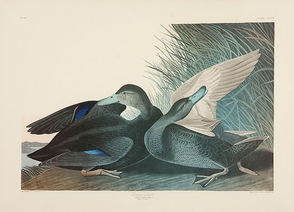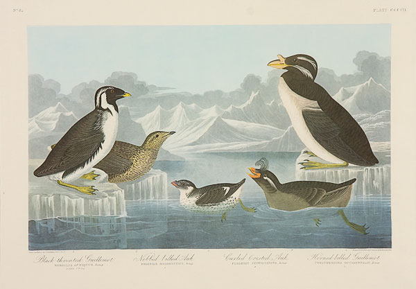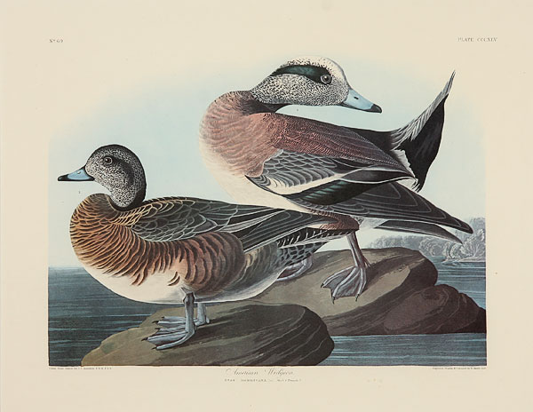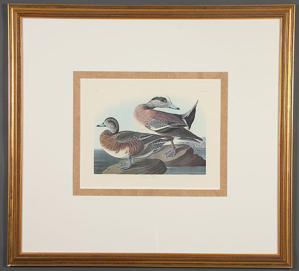AFTER JOHN JAMES AUDUBON (AMERICAN 1785-1851), A group of three offset chromolithographs, 20th century. Comprising a grouping of Gullemot and Auks, sight 20 inches x 28.25 inches; "Dusky Duck," sight 23.5 inches x 32.5 inches; and "American Widgeon," sight 16.5 inches x 21.5 inches. Each presented in a gilt and molded hardwood frame, one with linen-faced raised liner, the interior edge framed in gilt hardwood, the others with multiple mats and overlaid linen liners. Overall 36 inches x 44 inches to 39 inches x 48 inches.