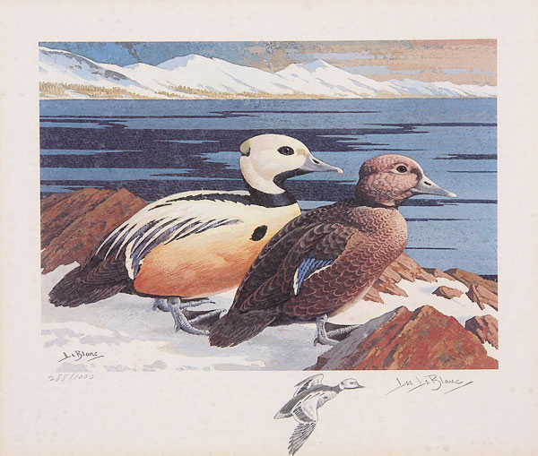 LEE LEBLANC (American 1913-1988), a pair of duck watercolors, one signed lower right and lower left, 13.75 inches x 12 inches each. Together with a "Stellar's Eiders" Federal Duck Stamp print.