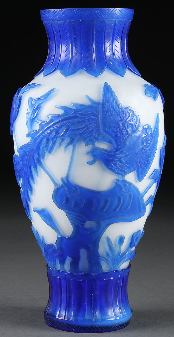A CHINESE PEKING-STYLE CARVED GLASS BALUSTER VASE, 20TH CENTURY. In opaque white overlaid with translucent blue and cut with a design of lotus blossoms, butterfly and phoenix bird. Height 11.75 inches (30 cm).