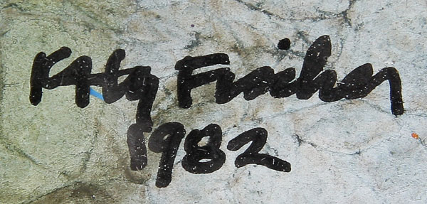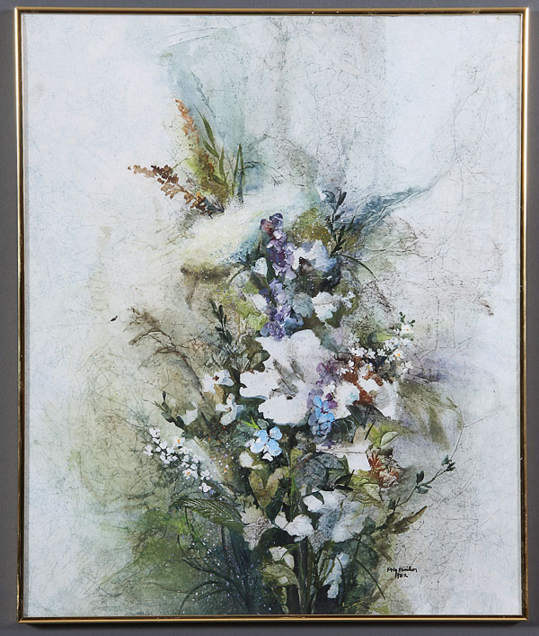 A GROUP OF THREE AMERICAN SCHOOL PAINTINGS AND PRINTS, 20TH CENTURY. Comprising KATY FISCHER (20th century), Floral Still Life - 1982, Mixed media, Signed lower right and dated "Katy Fischer 1982," 23 inches x 19 inches (58.4 x 48.2 cm); C. HOLDING (20th century) St. Georgels, Bermuda, Print, Signed in pencil lower right "C. Holding" and titled lower left, image size 12 inches x 16 inches (30.4 x 40.6 cm); and AMERICAN SCHOOL (20th century), Mountain View - circa 1980, Watercolor, Indistinguishably signed lower left "Soloman"?, 9.75 inches x 8.75 inches (24.7 x 22.2 cm). Together with a decorative seascape chromolithograph.