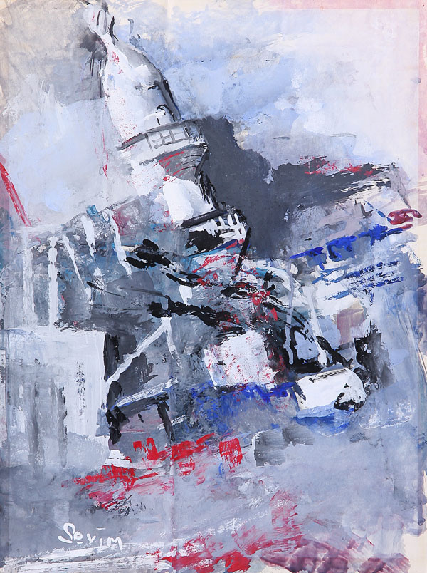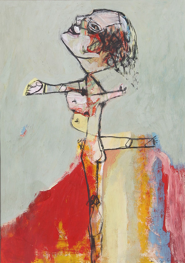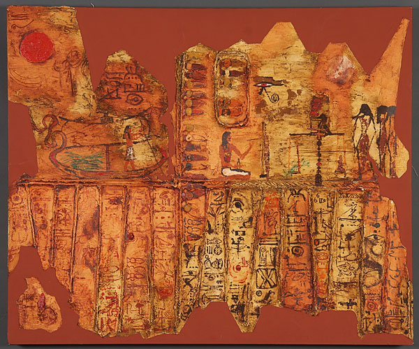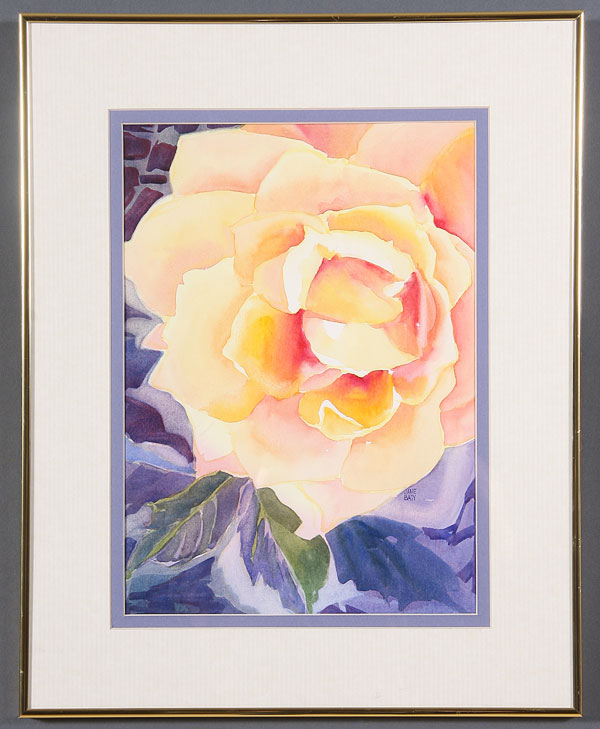 FOUR MODERN WORKS OF ART, 20TH CENTURY. Including Temo Javakhi (Georgian b. 1951) abstract portrait, oil on paper. Signed lower right and inscribed on verso. 11.5 inches x 16 inches. Jane Baty (American 20th century) "Yellow Rose" watercolor on paper, 10 inches x 14 inches; together with a multimedia abstract with ancient Egyptian theme inscribed on verso "Egyptian Tablet #1 Mueller '77" and an oil on paper abstract signed Seyim. The largest 30 x 36 inches.