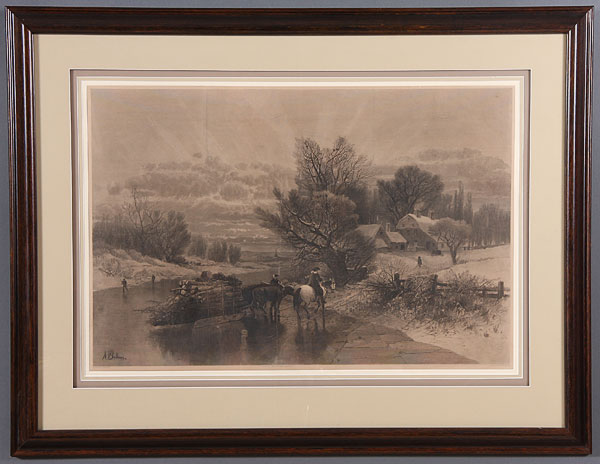 AFTER ALBERT FINCH BELLOWS (AMERICAN 1829-1883). "Winter Firewood Harvest," engraving, Copyright 1883 by W. Wellstood & Co. New York. Sight 18.5 inches x 27 inches. Presented in a triple raised shadow mat. Overall 29.25 inches x 38 inches.