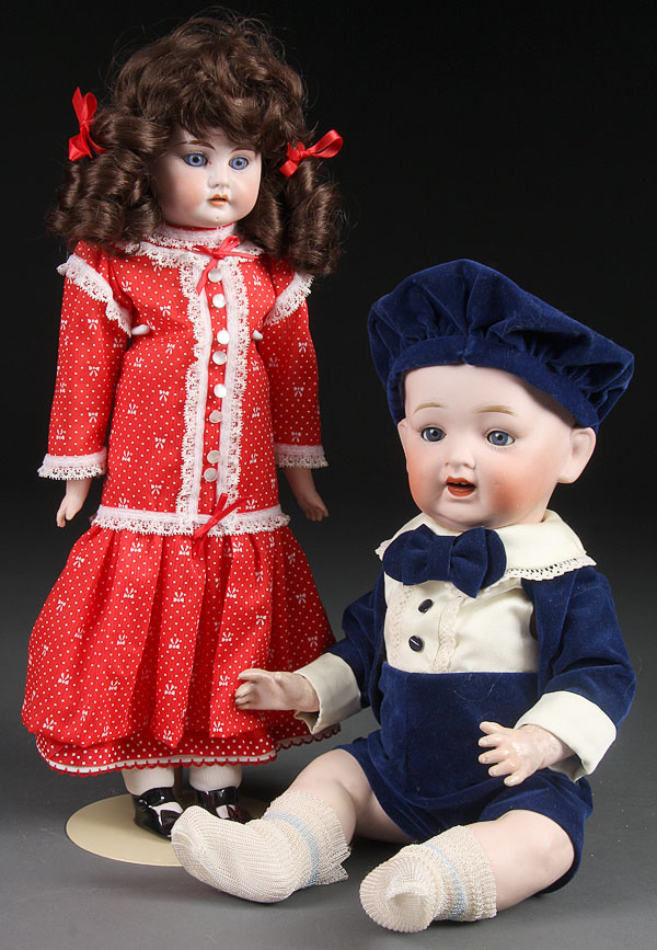 A JAPAN (NIPPON) ALL BISQUE TODDLER DOLL, length 17 inches. Together with a reproduction Heubach bisque doll with kid body. Height 17.5 inches.