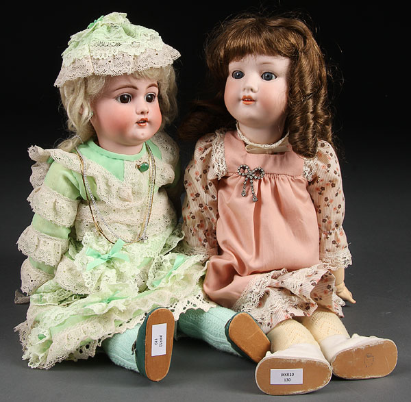 AN A&M BISQUE DOLL, #390 with new jointed compo body. Length 18 inches. Together with Simon Halbig bisque doll. Height 17 inches.