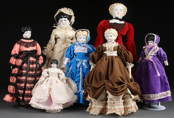 A GROUP OF SEVEN 19TH CENTURY PORCELAIN HEAD DOLLS, length 10 inches to 22 inches.