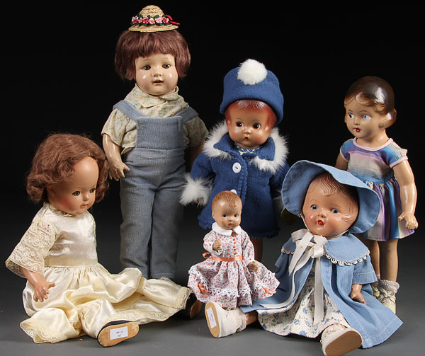 SIX HARD PLASTIC AND COMPOSITION DOLLS, EARLY TO LATE 20TH CENTURY. Including a later Effenbee "Patsy," a Giltoy compo marked "WOL" and others. The largest 17 inches.